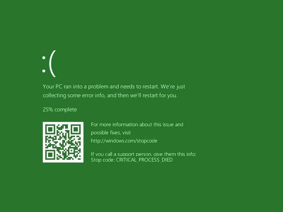 А смельчаки, тестирующие инсайдер-сборки, наверняка знакомы с его зеленым братом-близнецом — Green Screen of Death, сигнализирующем о сбое в непроверенной версии ОС.