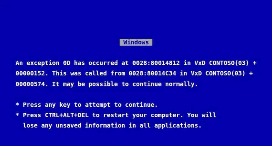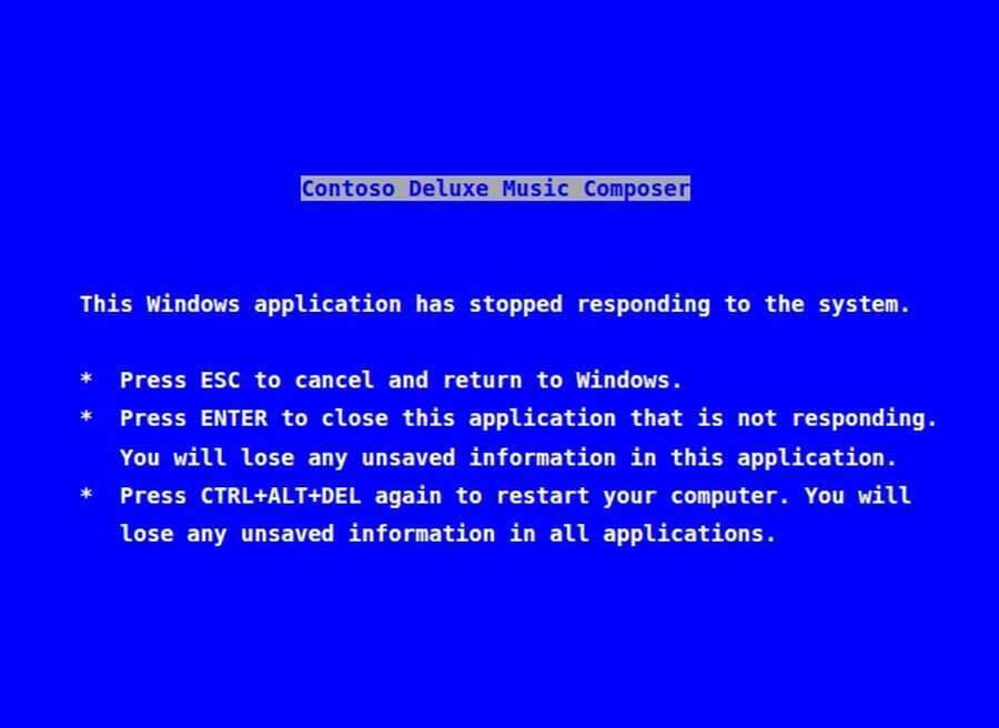 С выходом Windows 3.0 ситуация немного изменилась. Появились сообщения об ошибках на синем фоне, но, как вы уже знаете, это могли быть и не фатальные ошибки — скорее уведомления, после которого можно было продолжить работу. А вот по-настоящему серьезный сбой приводил к появлению «Черного Экрана Смерти» (Black Screen of Death) с текстом вроде: «Не удается продолжить работу Windows из-за…».