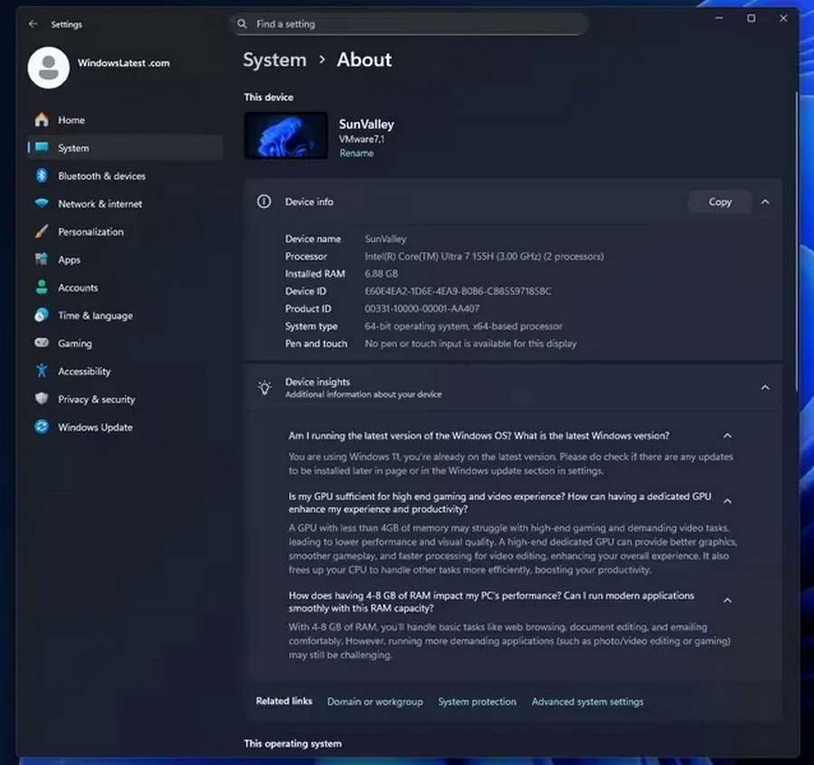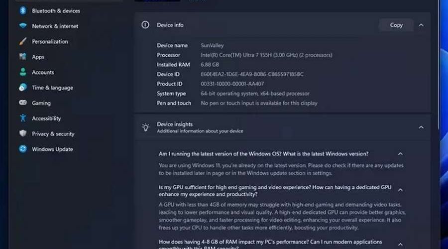 Такую информацию ОС пишет в новом разделе. В настройках Windows 11 в пункте «О системе» сейчас у большинства пользователей есть раздел с часто задаваемыми вопросами. Но в новой сборке KB5070311 вместо него появился новый раздел с анализом конкретного устройства.