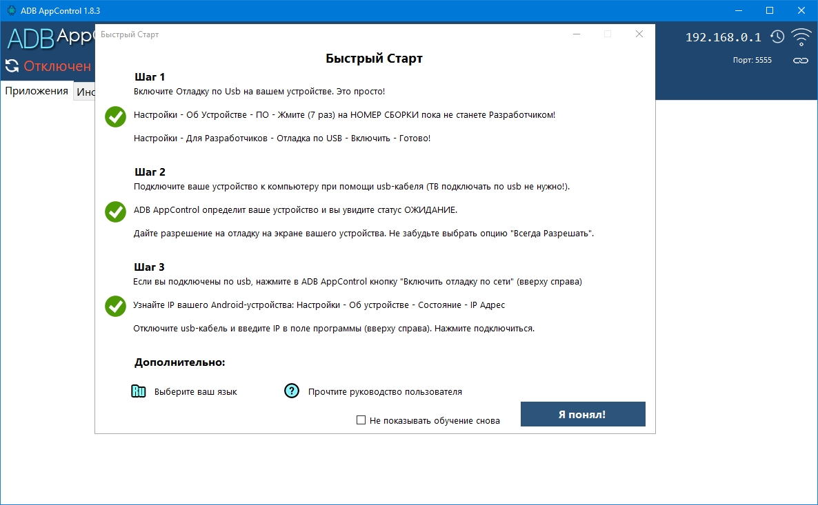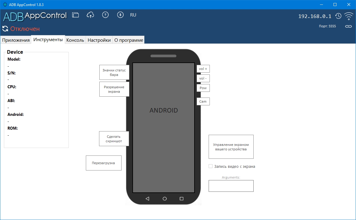 * Для работы программы необходимо включить отладку по USB на Андроид-устройстве!!!