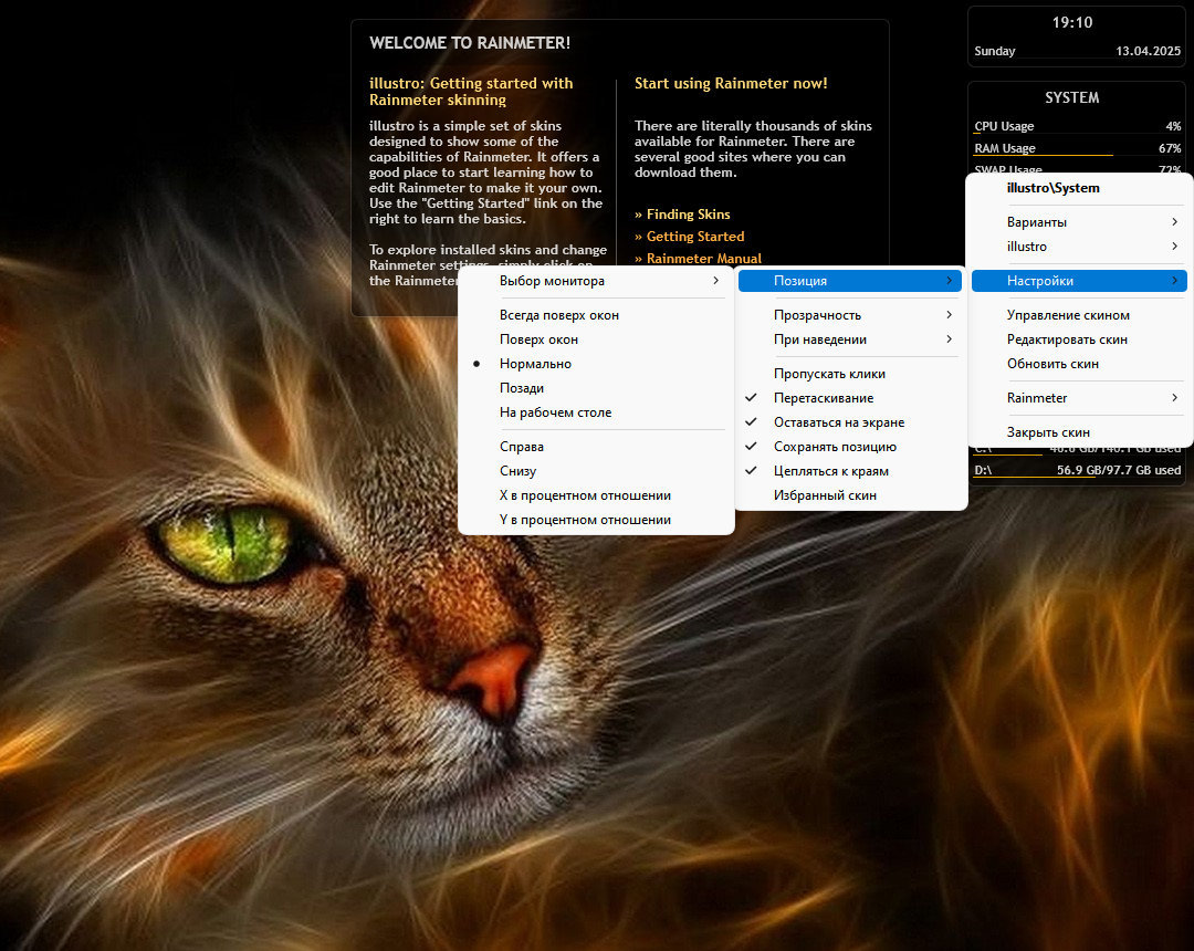 бесплатная утилита для мониторинга ресурсов компьютера, позволяет отображать: график загрузки центрального процессора, количество свободной и занятой памяти компьютера (оперативной, виртуальной и дисковой), наблюдать сетевую информацию, включая IP-адрес, трафик, скорость использования канала отдельно по каждому из направлений, загрузка новостных лент и прогноза погоды. Rainmeter обладает информативным и приятным пользовательским интерфейсом, который с легкостью вписывается в окружение рабочего стола. Отличительной особенностью программы и одним из факторов её широкого распространения является стиль отображения информации, при котором большинство элементов оформлено таким образом, что создается ощущение, будто каждый из них является составной частью Вашего Рабочего стола!
