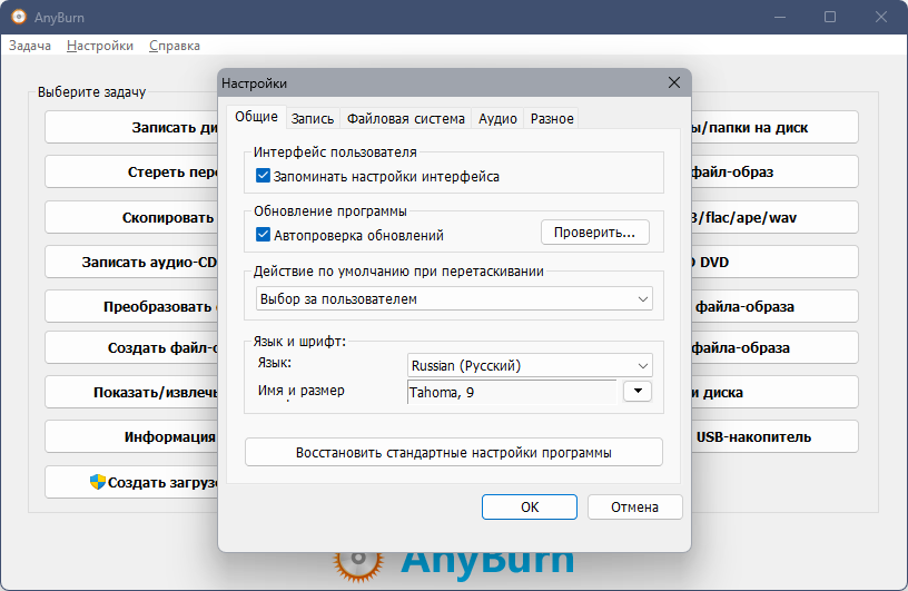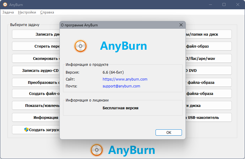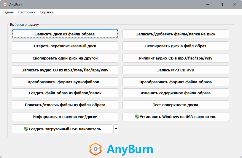 Any Burn - небольшая бесплатная утилита для работы с CD/DVD/Blue-ray дисками. Интерфейс программы достаточно удобен: главное окно представляет собой набор закладок, которые выбираются в зависимости от конкретной задачи. Можно записать на диск готовые образы или отдельные файлы и папки, записать Audio-CD из имеющихся файлов аудиоформата, стереть перезаписываемый диск, создать образ диска или отдельных папок/файлов, скопировать диск и др. операции. Этот инструмент станет неплохой альтернативой существующим платным и "тяжелым" программам по управлению CD/DVD/Blue-ray дисков.