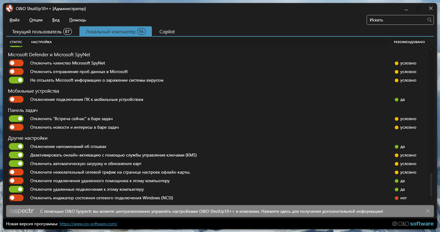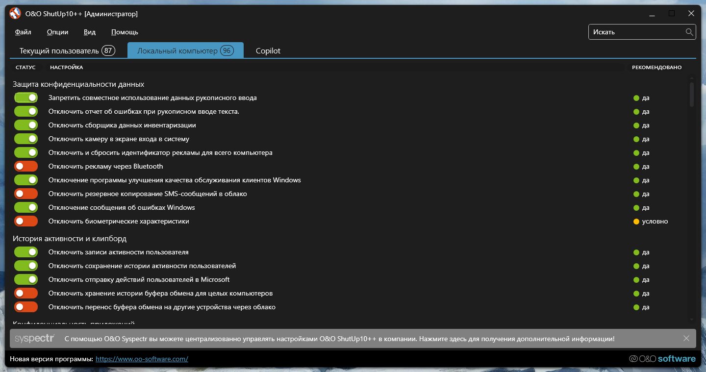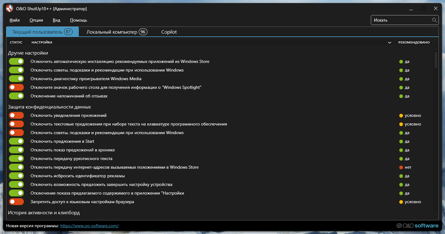 Основные возможности O&O ShutUp10:
