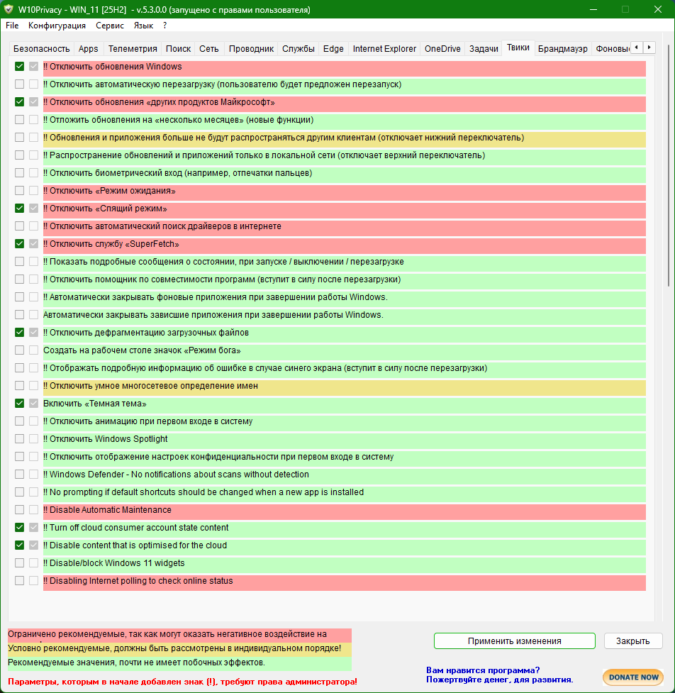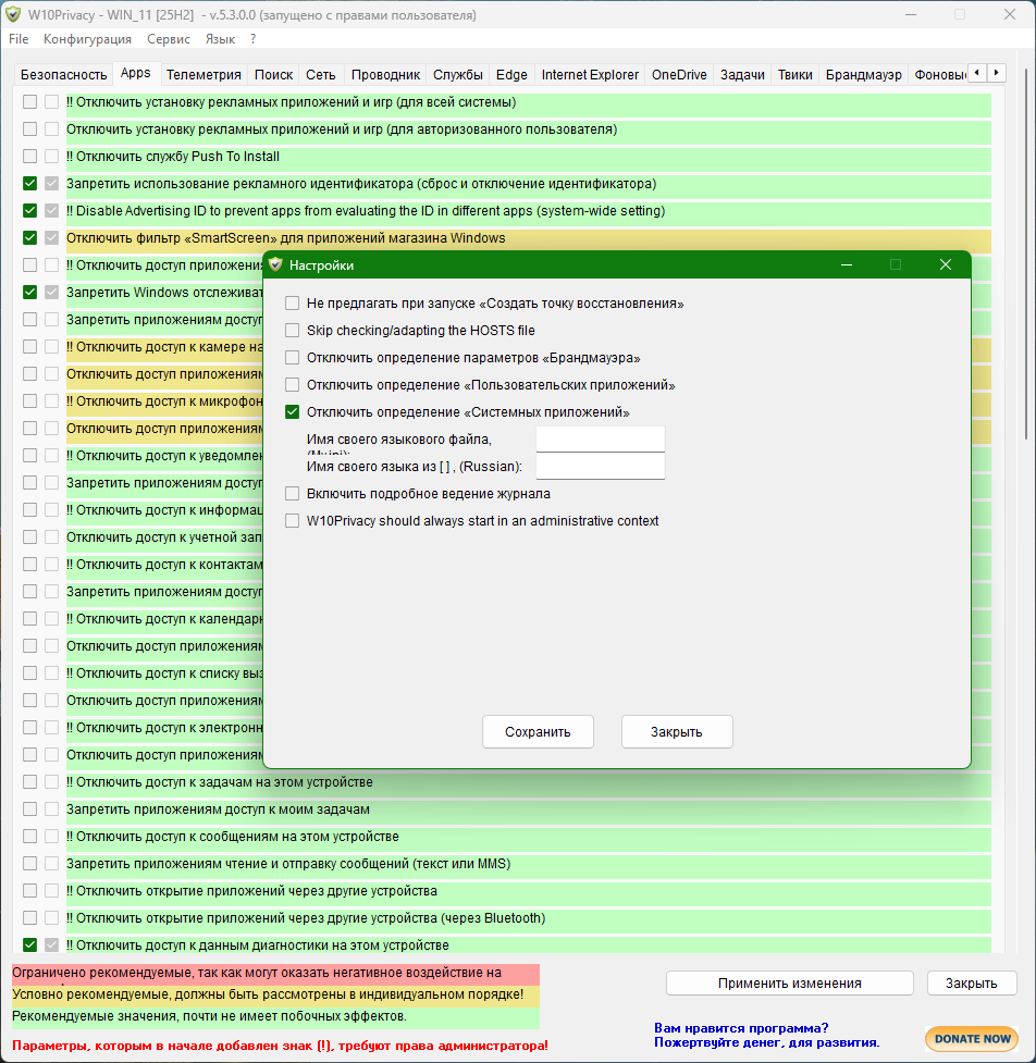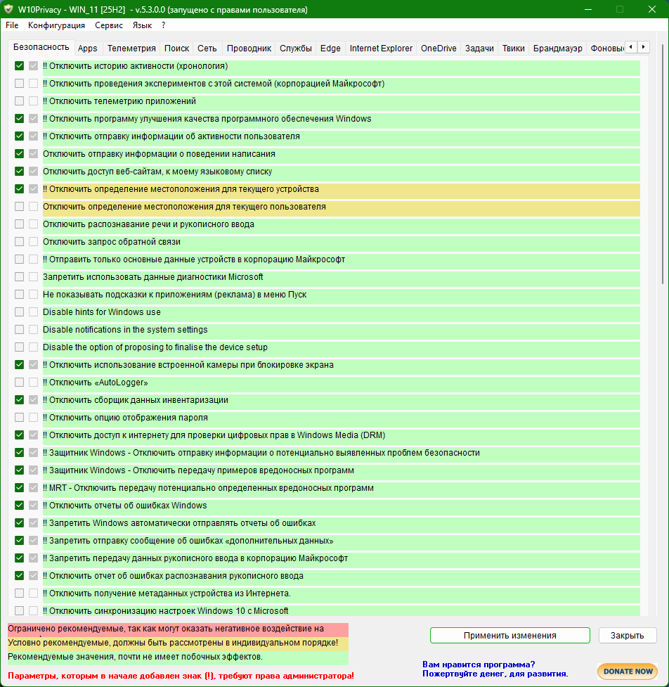 W10Privacy - программа для изменения настроек системы Windows 10 и минимизации сбора данных пользователя. Предлагает серьезный набор защиты данных и настроек конфиденциальности, главное не ошибиться в выборе. Программа четко отображает доступные для изменения параметры, разделенные на 12 разделов, в которых вы самостоятельно выбираете настройки, которые следует включить/отключить.