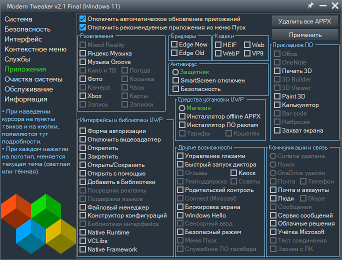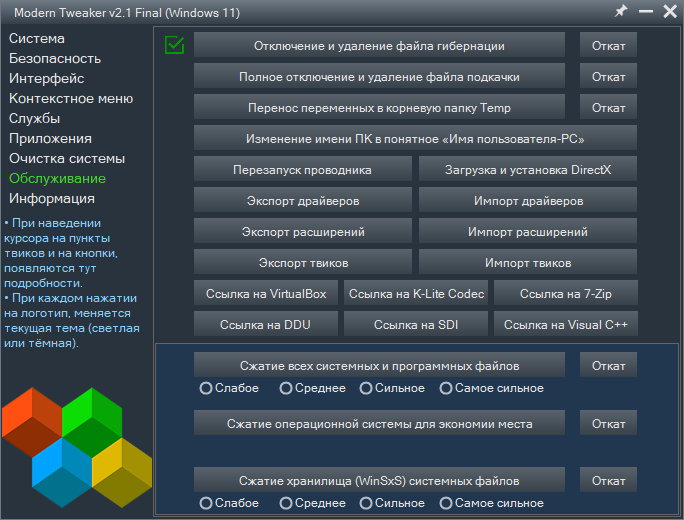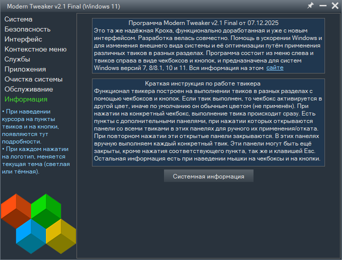 Основные изменения в релизной версии твикера "Modern Tweaker" под номером 2.1 Final от 07.12.2025.