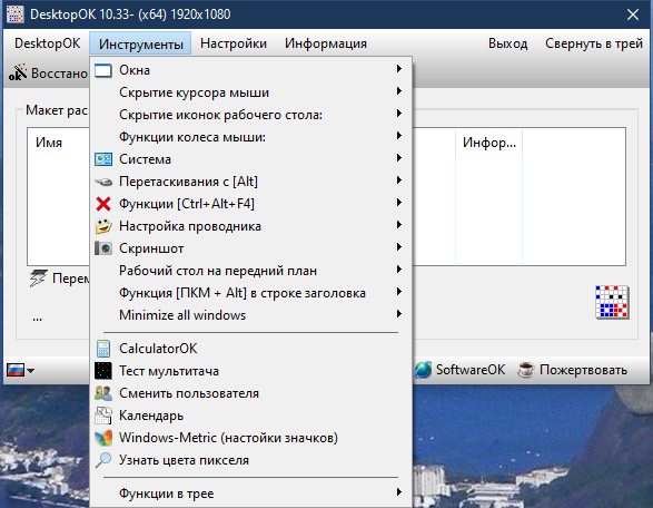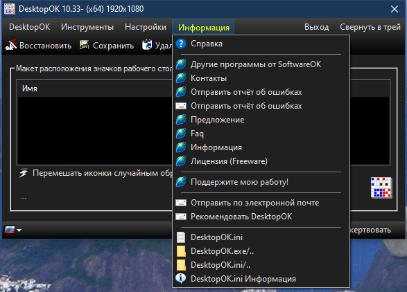 Из-за встроенных дополнительных инструментов рабочего стола она практически незаменим на каждом ПК с Windows, поэтому имя также является DesktopOK, а не просто Icon Save. Я хотел бы расширить его другими полезными функциями, чтобы они соответствовали названию, вы можете найти их в меню «Инструменты», большинство из них говорят сами за себя!