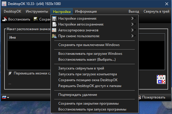 ◆ Автоматическое сохранение макета значков на рабочем столе