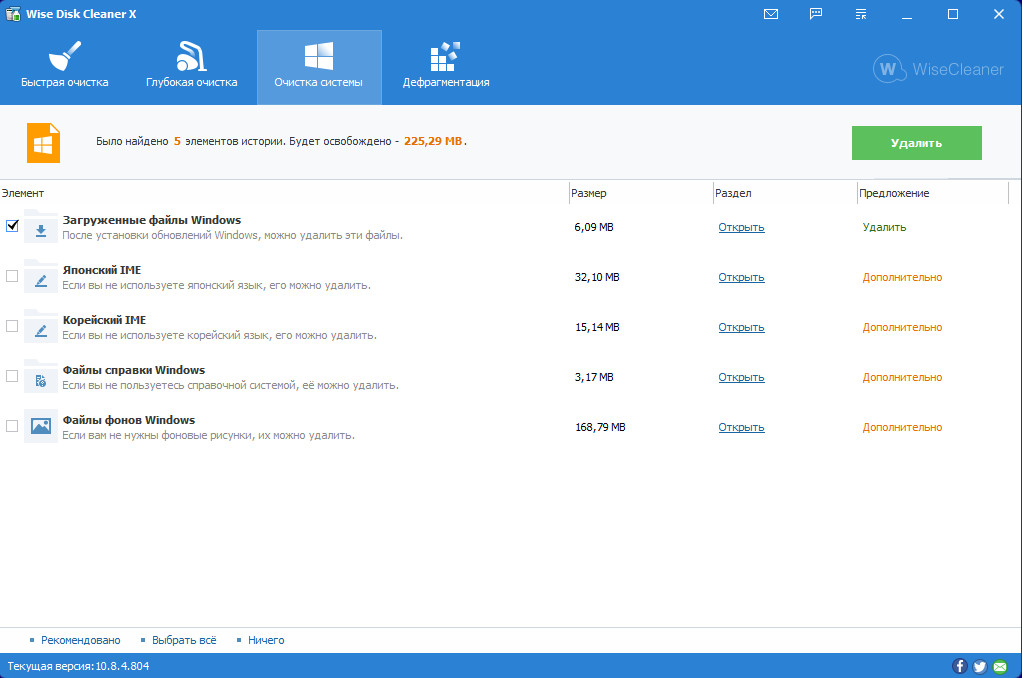 Wise Disk Cleaner - бесплатная, быстрая, удобная и простая в использовании утилита для очистки жестких дисков от ненужных, временных и неиспользуемых файлов. Определяет более 50 типов мусорных файлов, а также можно самостоятельно добавлять новые форматы. После сканирования системы на наличие нежелательных файлов можно просмотреть подробную информацию о каждом и самостоятельно решить, что удалять.