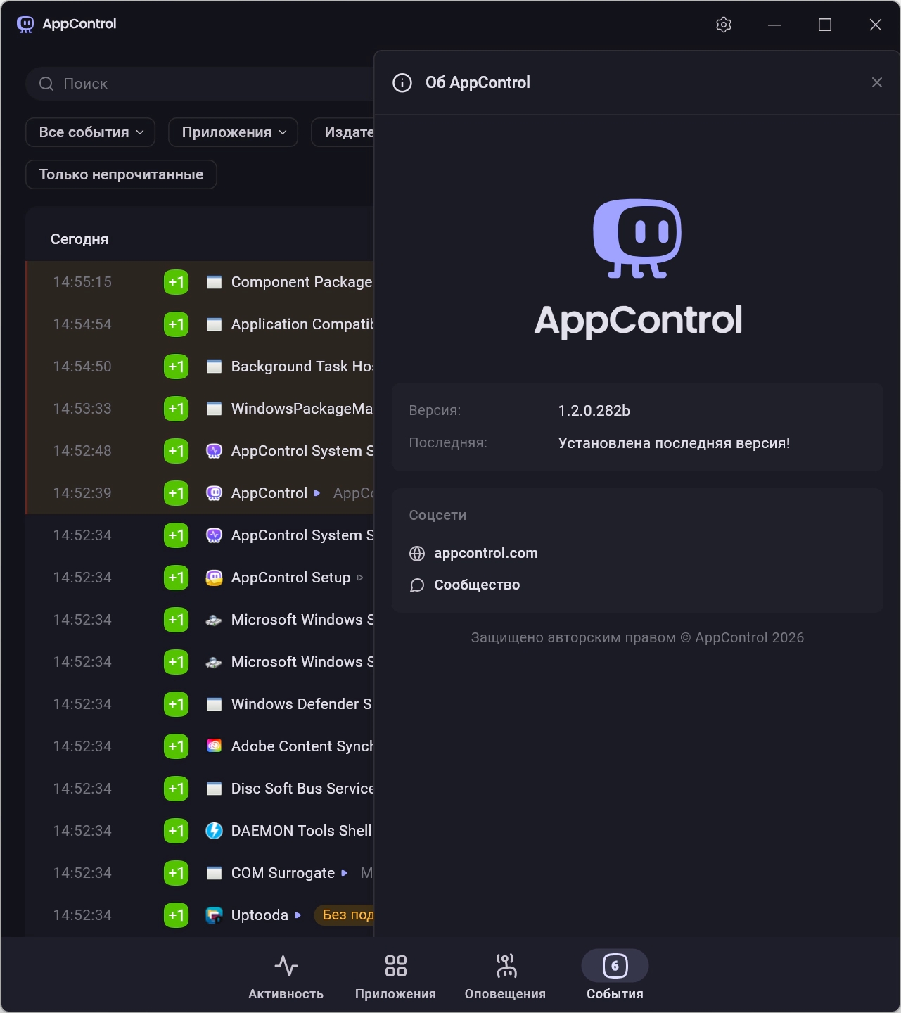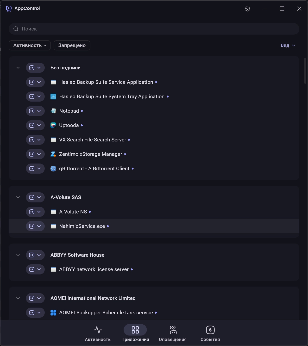 На вкладке «Приложения» представлен список всех приложений, запуск которых был зарегистрирован во время работы AppControl. Для них можно просмотреть события, информацию, отобразить только те, которые запрашивали доступ к камере, микрофону или местоположению, при необходимости — запретить запуск.