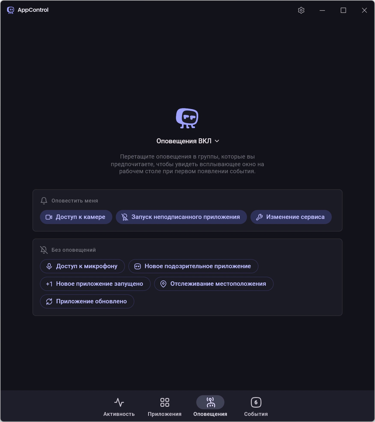 Вкладка «Оповещения» позволяет настроить появление сообщений в центре уведомлений Windows при тех или иных событиях: например, при запуске подозрительных приложений, запросе на доступ к камере и других.