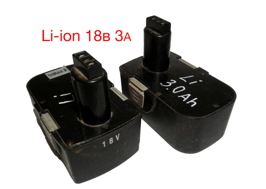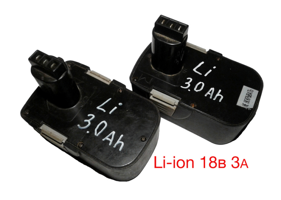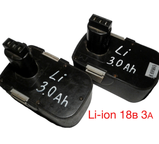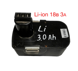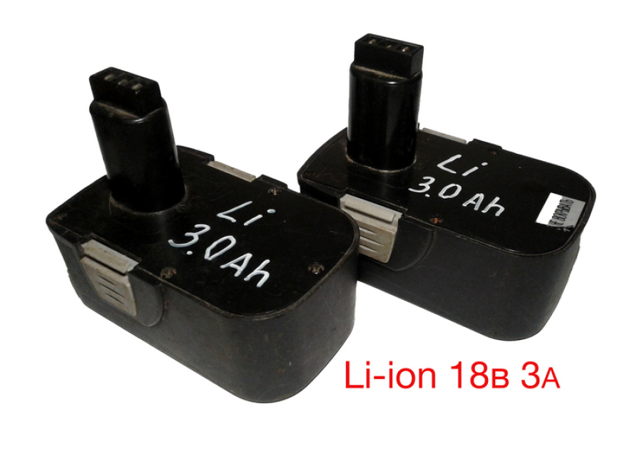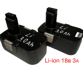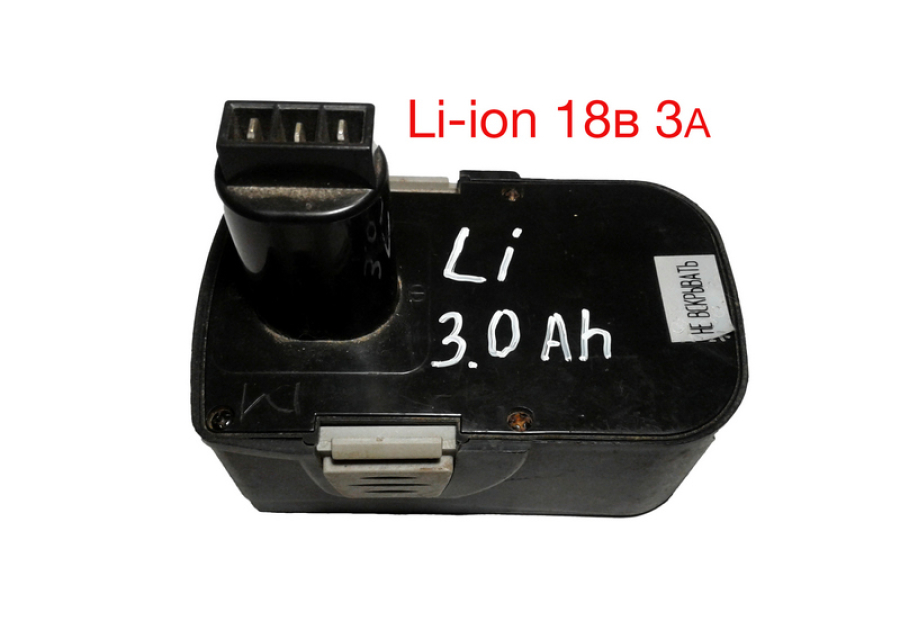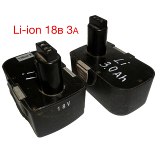 Переделанный с Ni-Cd на Li-ion аккумулятор для шуруповерта 'Интерскол'. 18 вольт 3.0 ампера. Зарядка производится штатным зарядным устройством.