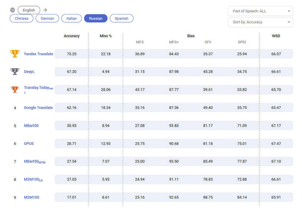 Исследователи собрали базу данных из нескольких тысяч предложений на английском языке с омонимами — одинаковыми по написанию словами, имеющими разное значение. Модели и сервисы перевели эти предложения, а алгоритмы бенчмарка определили процент корректно переведённых слов. Кроме того, правильные варианты выборочно проверяли профессиональные переводчики, а затем на основе этих показателей и был сформирован публичный рейтинг.