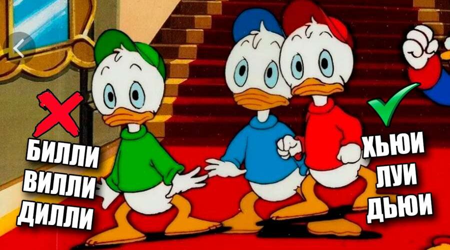 Возьмем, к примеру, культовый диснеевский мультсериал "Утиные истории", который шел по отечественному телевидению в 90-е годы. Вы помните, как зовут племянников Скруджа МакДака? Многие из вас скажут - Билли, Вилли и Дилли. Вот только это не совсем так.