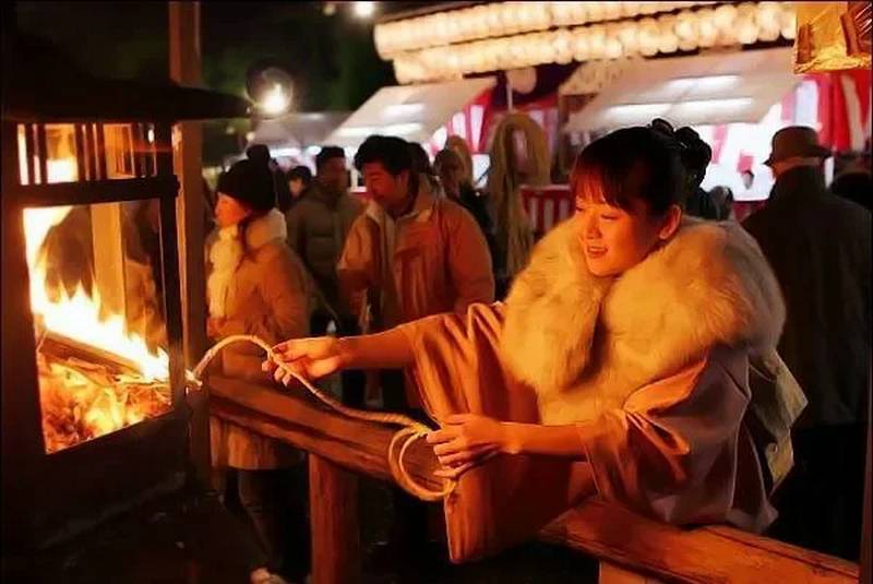 В первые мгновения нового года в храмах зажигают священный огонь Окэра Маири, для розжига которого используются высушенные корни хризантем. От этого огня японцы поджигают особые ритуальные веревки, сплетенные из соломы и разносят священное пламя по своим домам, где потом несколько дней жгут волшебные костры.