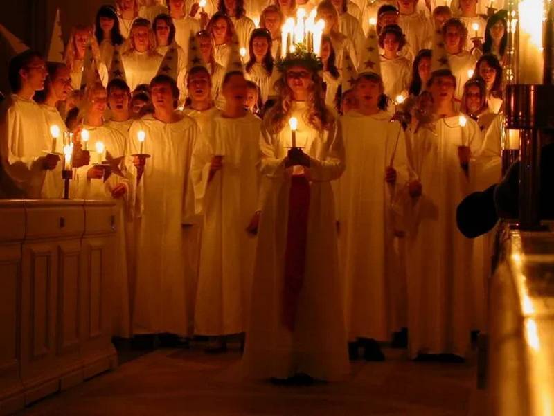 По новогодним традиция в Швеции Новый год не наступит, пока не будет выбрана королева света Лючия - покровительница домашнего очага. Именно эта прекрасная юная девушка отвечает за новогодние традиции и подарки в новогоднюю ночь для детей. Пока юная леди одаривает детишек, шведы готовят ароматную рисовую кашку, щедро добавляя в нее миндаль, масло, изюм и мед для местного Деда Мороза Юльтомтена, похожего больше на забавного гномика в красной теплой одежде. Кашу нужно оставить или под елкой, или на пороге дома.