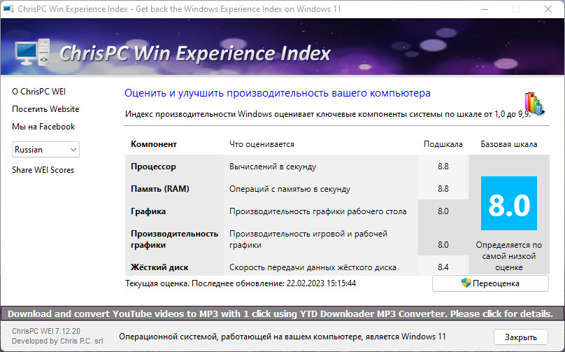 бесплатная утилита, с помощью которой можно самостоятельно измерить системный индекс производительности в Windows (в последних версиях Windows разработчики отказались от графической формы этого инструмента).