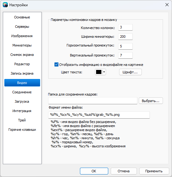 - функция позволяет автоматически извлечь заданное количество кадров из видеофайлов большинства современных форматов. Вы можете указать, сколько скриншотов нужно сделать, и программа равномерно распределит их по всей длительности ролика. Полученные кадры можно загрузить на хостинг по отдельности или скомпоновать в одну общую картинку-мозаику. Такой подход идеален для создания наглядных галерей для торрент-трекеров, видеообзоров или новостных сайтов. Программа может использовать как системные кодеки, так и встроенные, что обеспечивает совместимость с любыми видеофайлами.