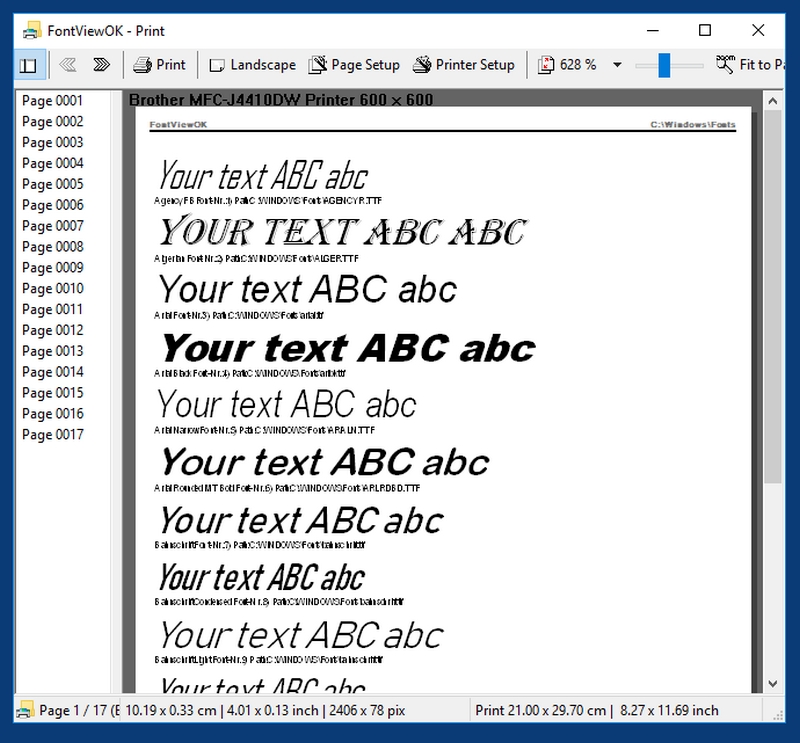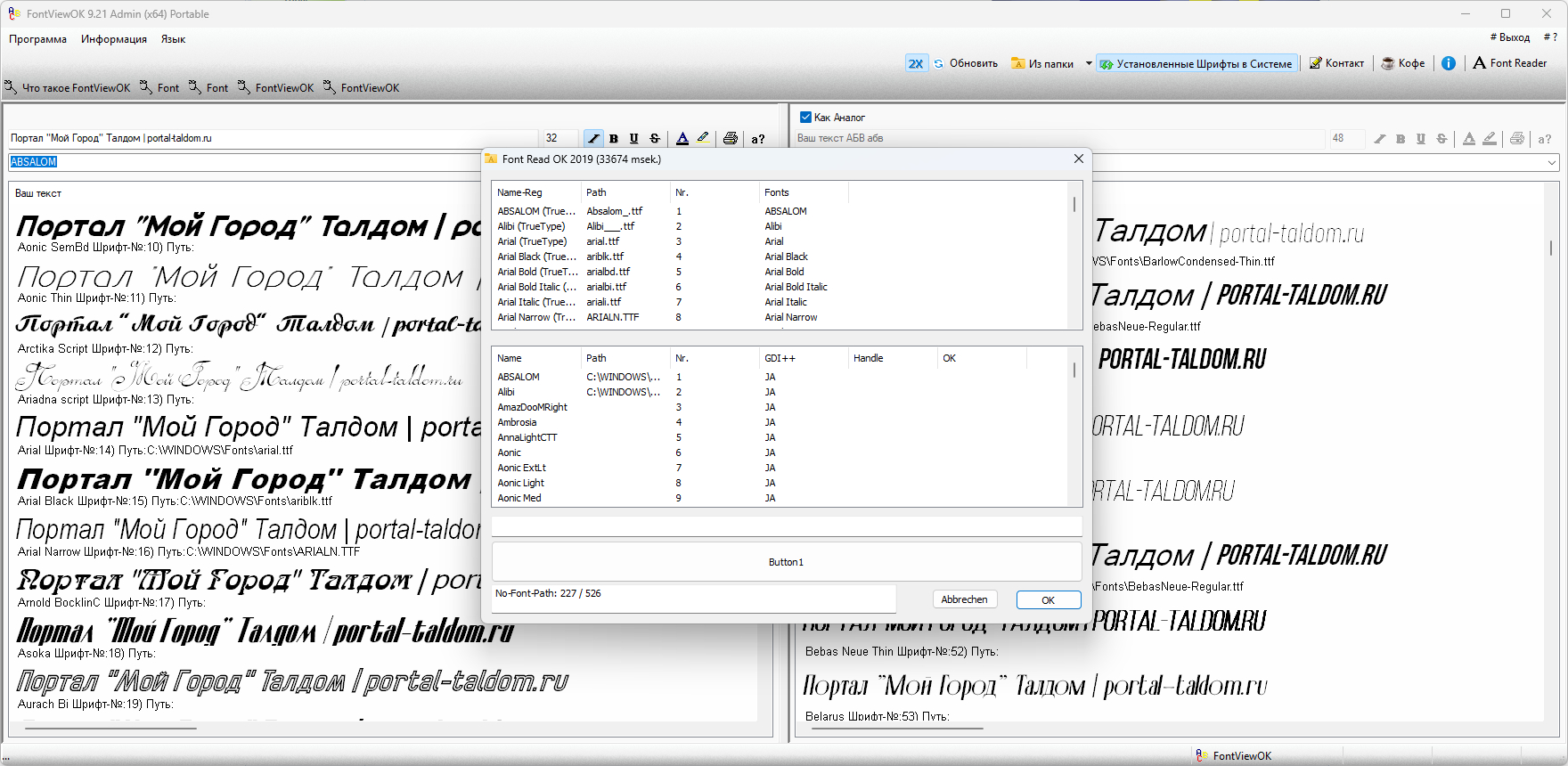 FontViewOK - бесплатная программа, которая после запуска отобразит пользователю все установленные в его операционной системе шрифты и, конечно, Вы сможете с ними работать. Особенность программы - она позволяет вводить любой текст в специальное отведенное поле и сразу просматривать результат, то есть сразу будет видно, как набранное слово будет смотреться в том или ином стиле шрифта. Помимо этой возможности, FontViewOK позволит пользователям изменять не только цвет шрифта, но и редактировать его размер, стиль и прочие другие параметры. В FontViewOK есть предварительный просмотр в двух окнах для быстрого сравнения двух шрифтов. Хорошо подходит для прямого сравнения. Адаптация шрифта независима в обеих панелях.