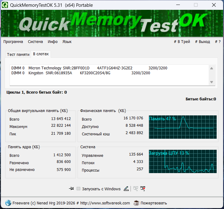 QuickMemoryTestOK - небольшая, но эффективная утилита для быстрой проверки оперативной памяти на наличие ошибок.