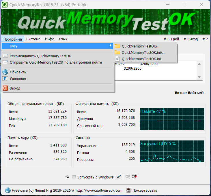 • Для портативного использования, пожалуйста, создайте или скопируйте в рабочую директорию QuickMemoryTestOK файл QuickMemoryTestOK.ini