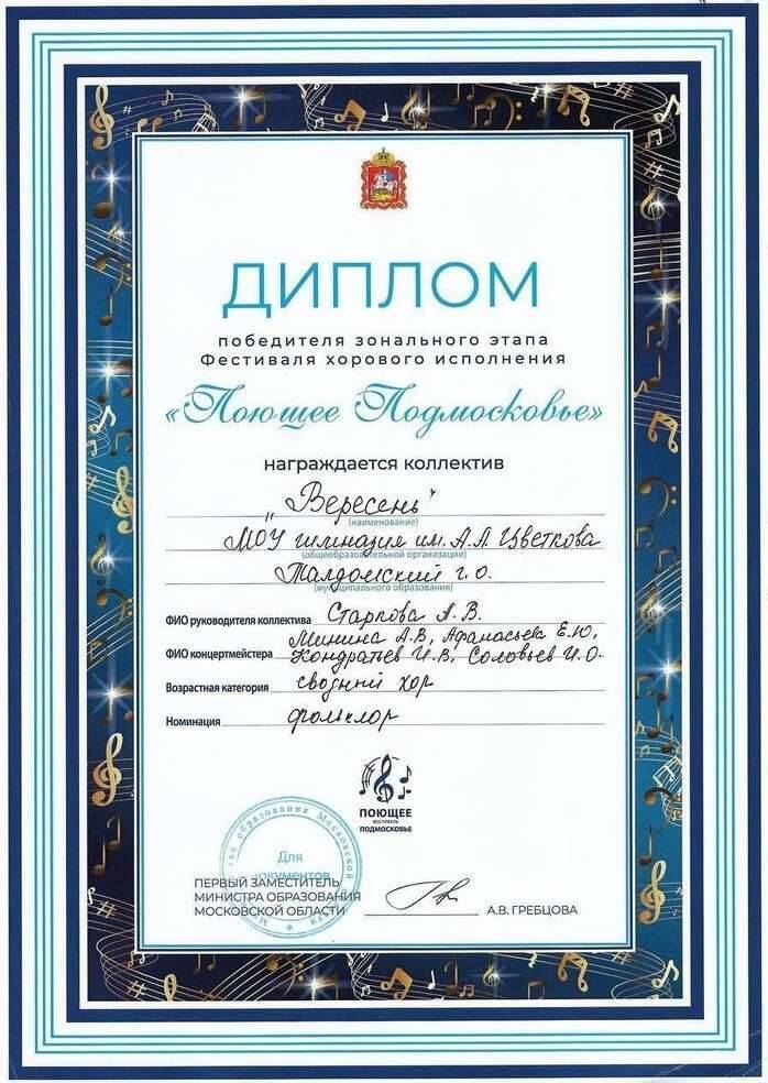 Талдомский городской округ по праву гордится своими юными талантами. "Вересень" – это не просто ансамбль, это символ сохранения и приумножения культурного наследия, живое воплощение любви к Родине и ее традициям. Мы с нетерпением ждем новых выступлений и побед "Вересеня" на региональном этапе "Поющего Подмосковья" и верим, что их путь будет усыпан новыми достижениями и признанием. Пусть их голоса продолжают звучать, прославляя красоту русского фольклора!