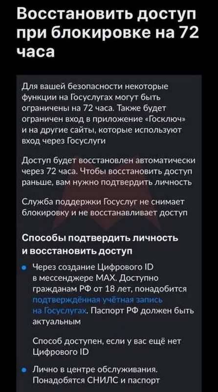 фото: Telegram «Новости Москвы»Далее приложение сообщает, что ограничения будут автоматически сняты через 72 часа, а чтобы восстановить доступ раньше, необходимо подтвердить личность. Предлагается всего два способа сделать это: либо лично обратиться в центр обслуживания в МФЦ, либо создать «Цифровой ID» в мессенджере Max.